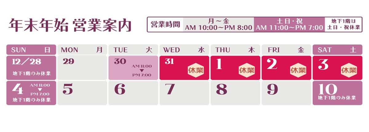 当店の年内最後の営業日は 12月30日(火)年明けは 1月4日(日)から営業いたします。